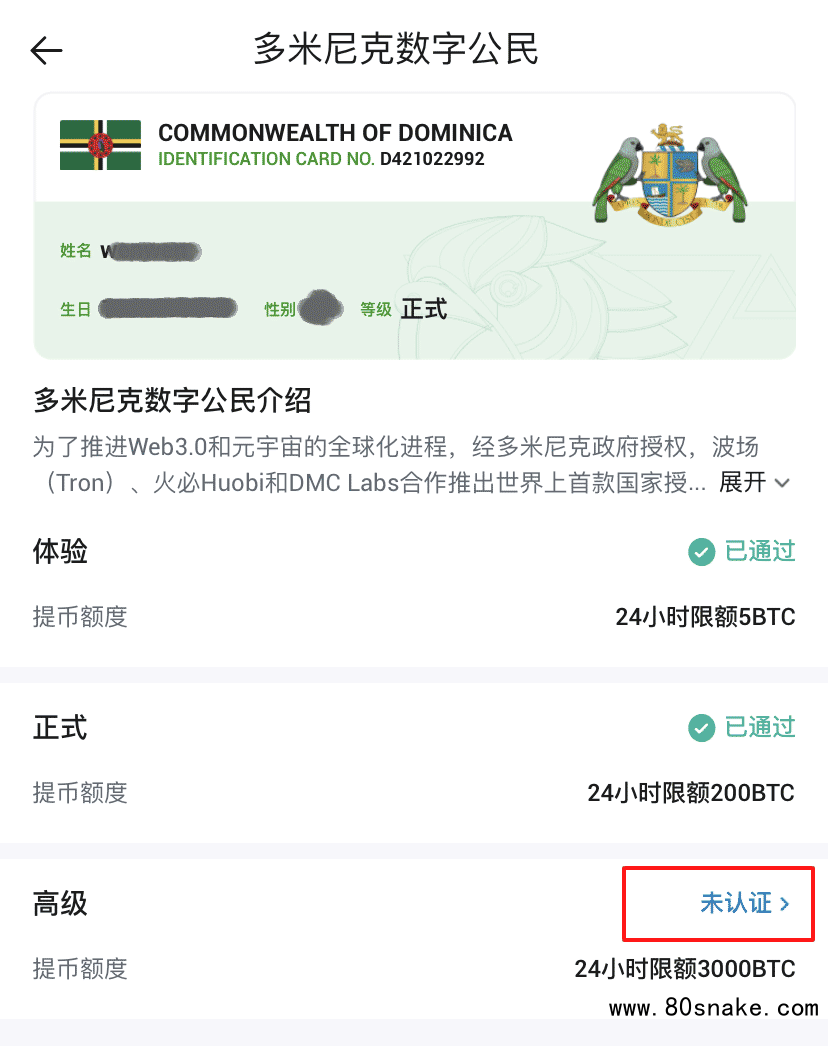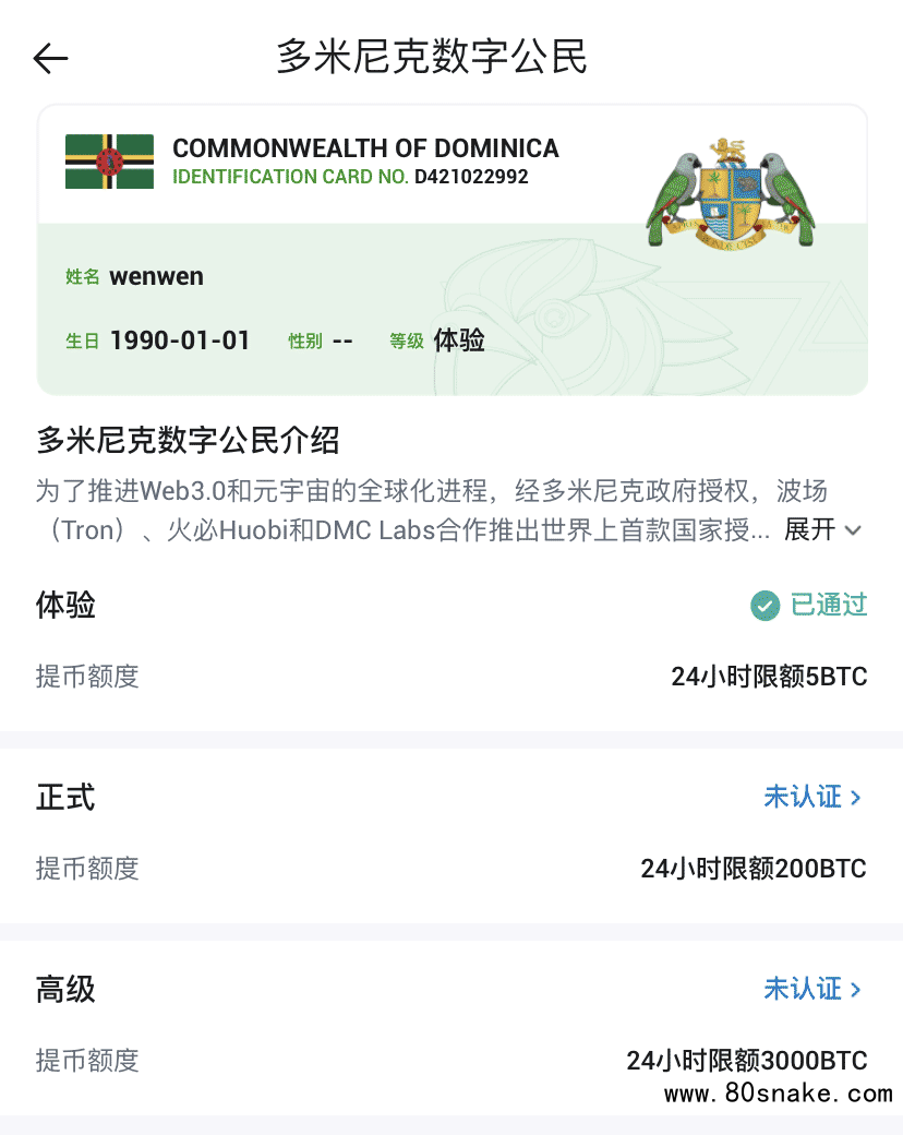 至此全部火币身份认证完成,您已经拥有了高级多米尼克数字公民身份。