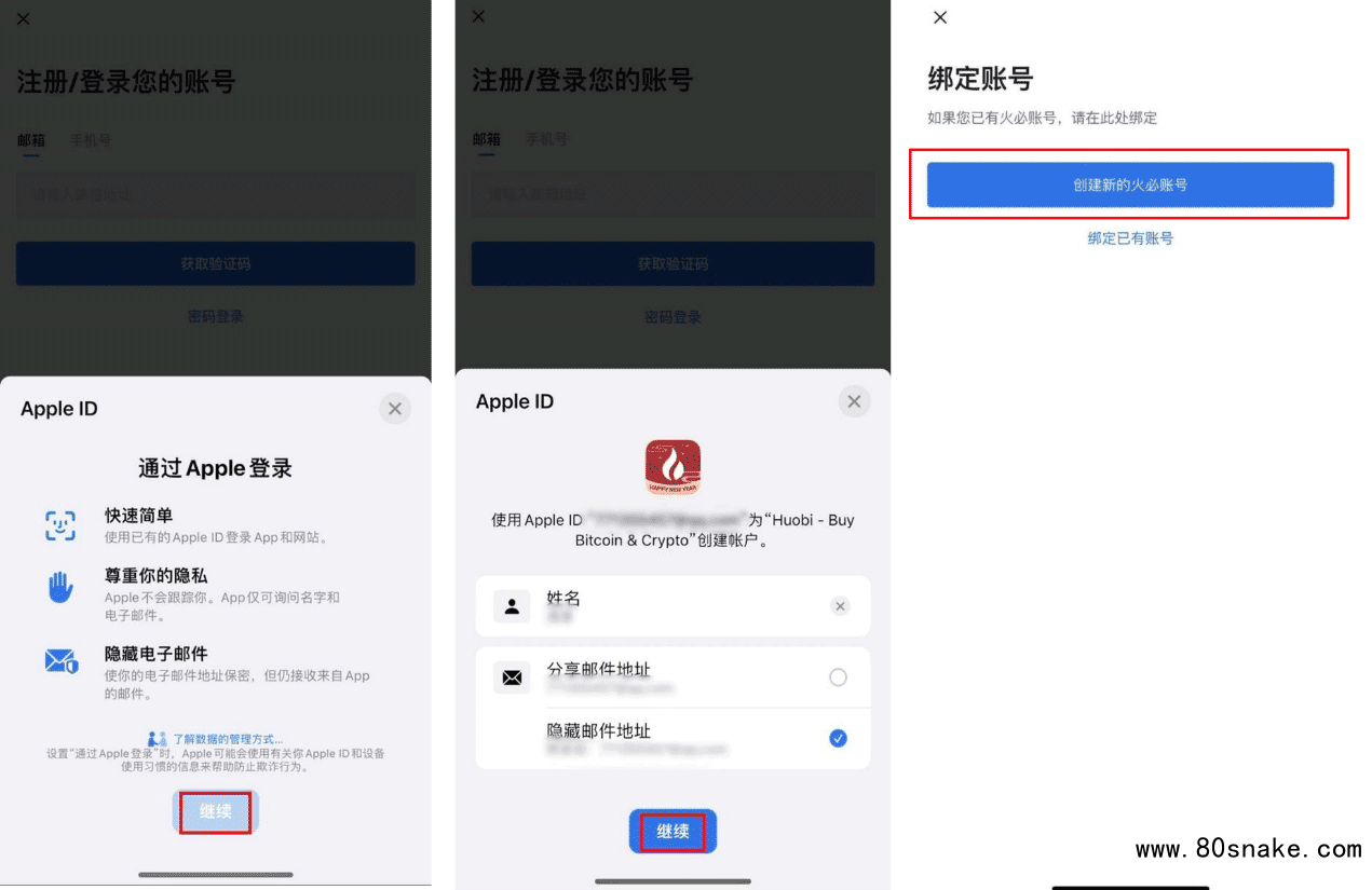 在注册页面,选择【通过Apple登录】,系统将提示您使用的Apple ID登录火币,点击【继续】。选择【分享邮件地址】或者【隐藏邮件地址】,点击【继续】。选择【创建新的火币账号】,跳转至设置密码,随后完成注册。
