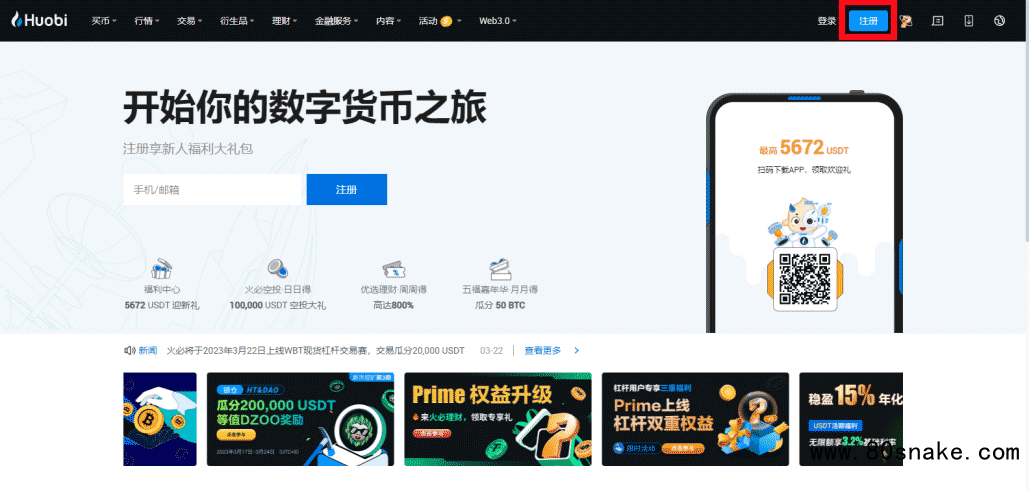 1、打开火币官网huobi.com,在上方点击【注册】。