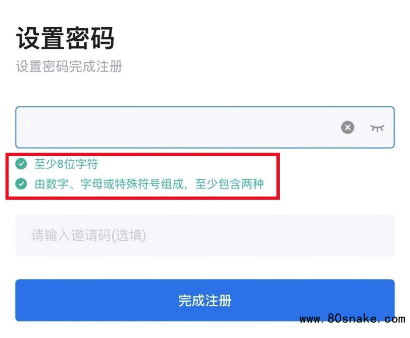 2、为您的账户设置密码。为了账户安全,设置账户密码时,请确保密码由数字、字母或特殊符号组成,至少包含两种,长度至少8位字符,格式合格后密码下方的要求会变成绿色。