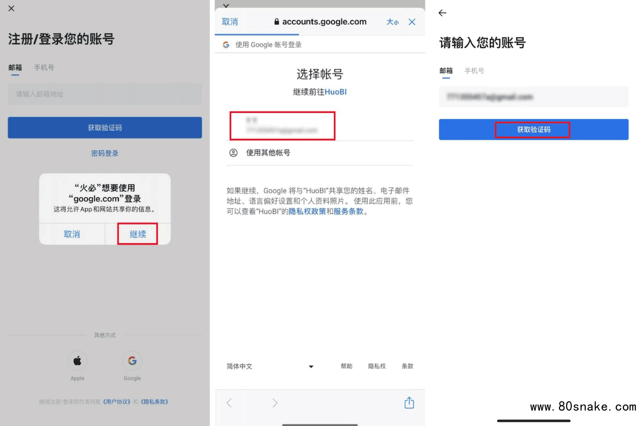 在注册页面,选择【通过 Google 登录】,弹窗提示“火币”想要使用“google.com”登录,点击【继续】。在窗口登录Google账号,点击你的谷歌账号即可跳转至火币APP。此时界面会显示您的Google账号邮箱,点击【获取验证码】。您将在邮箱收到一个6位数的验证码。请在30分钟内输入该验证码,然后点击【提交】。设置密码后即完成注册。