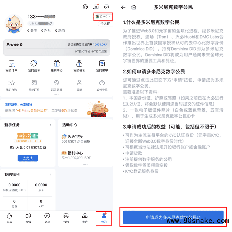 1、打开火币APP,登录账号,点击右下角“我的”,然后点击上方的“DMC”,点击页面下方“申请成为多米尼克数字公民L1”。