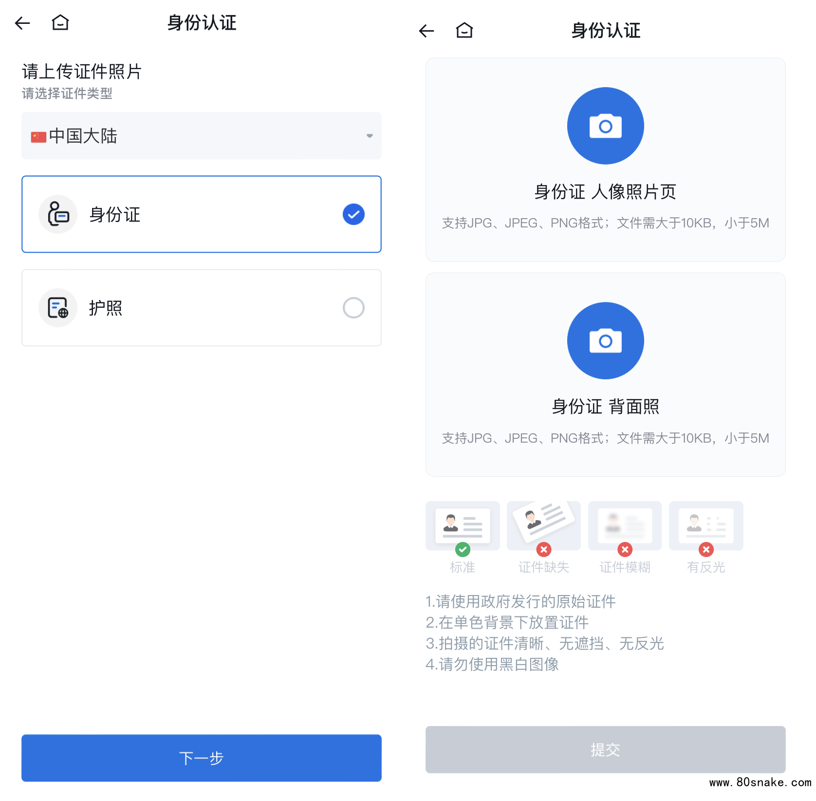 2、根据所在国家,选择合适的身份证件,点“下一步”,上传或拍摄身份证件的正反面,然后点击“提交”。等待片刻,正式即L2身份认证完成。
