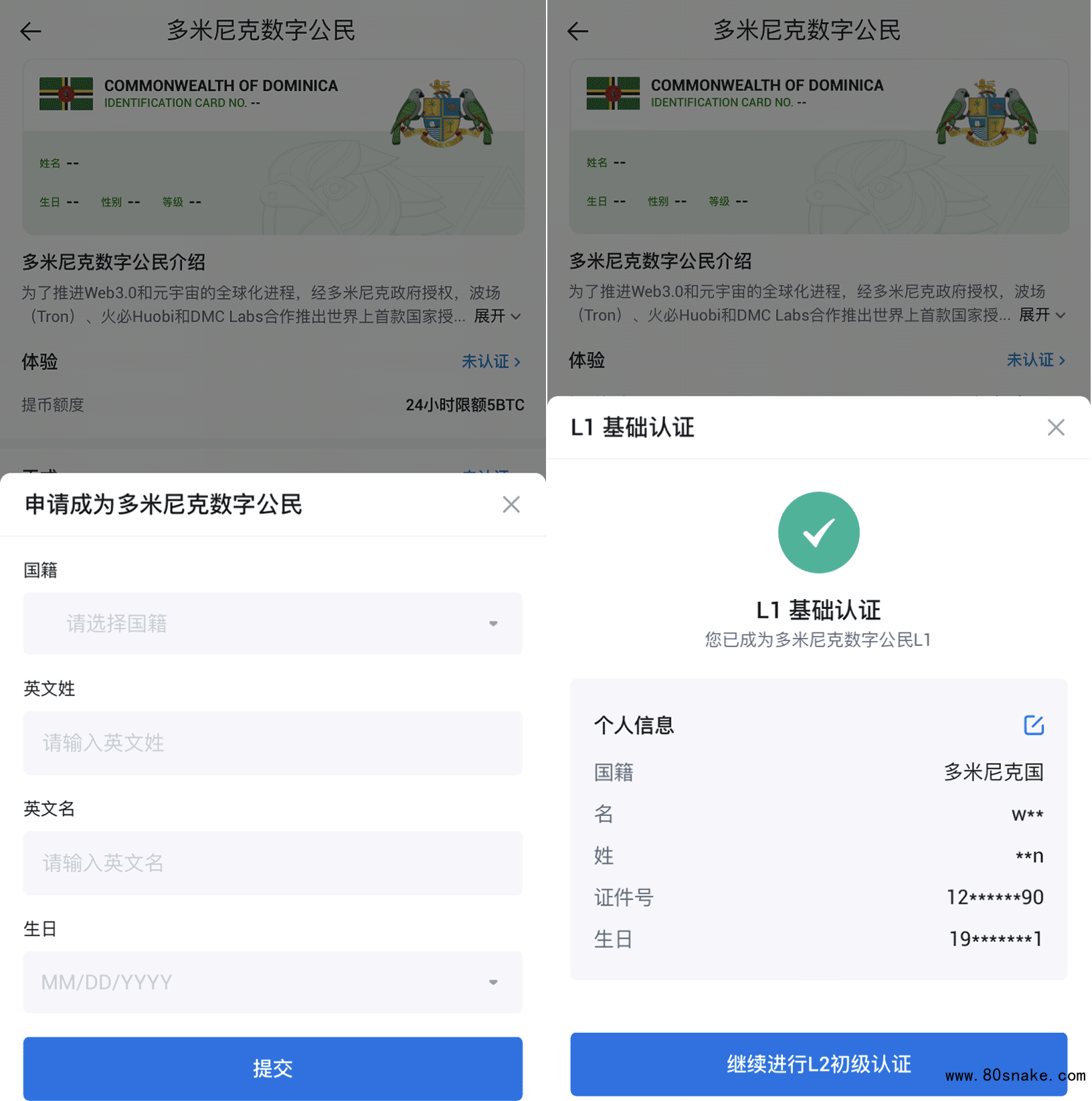 2、选择国籍,输入英文姓名和生日,最后点击提交,即可完成L1基础认证。