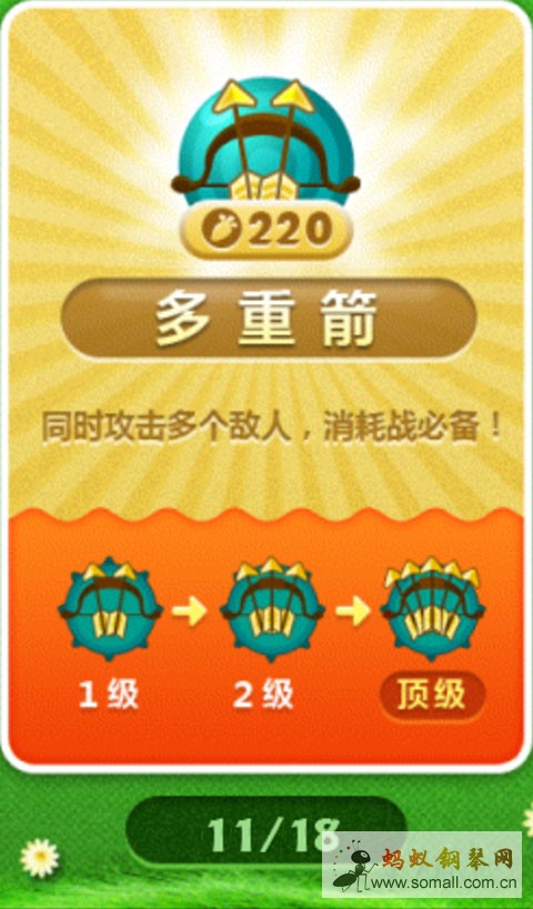 普通的多体伤害炮塔,兼具爆发伤害和群体伤害的属性,放在路边可以在最近的一格产生爆发式伤害(多支箭伤害的叠加)。主要克制巨怪,对付飞行怪和小喽喽还可以,也比较适合用来清道具。