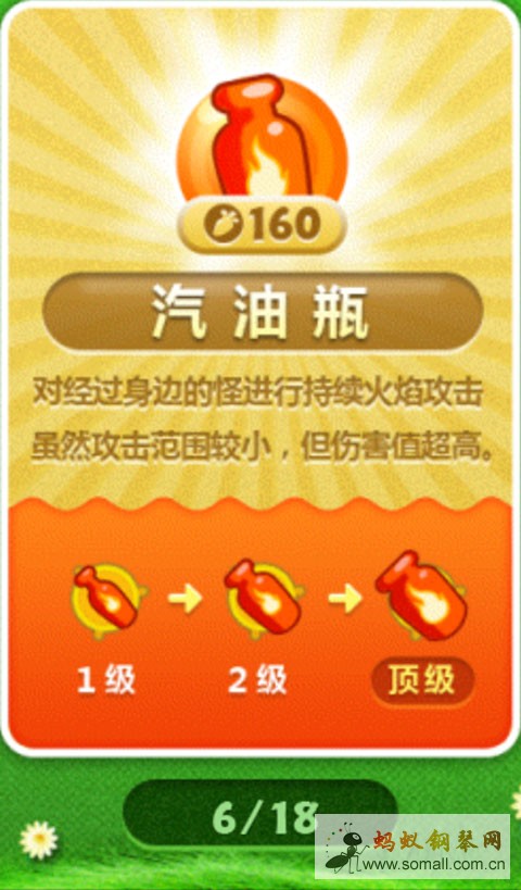 “对经过身边的怪进行持续火焰攻击,虽然攻击范围较小,但伤害值超高。”