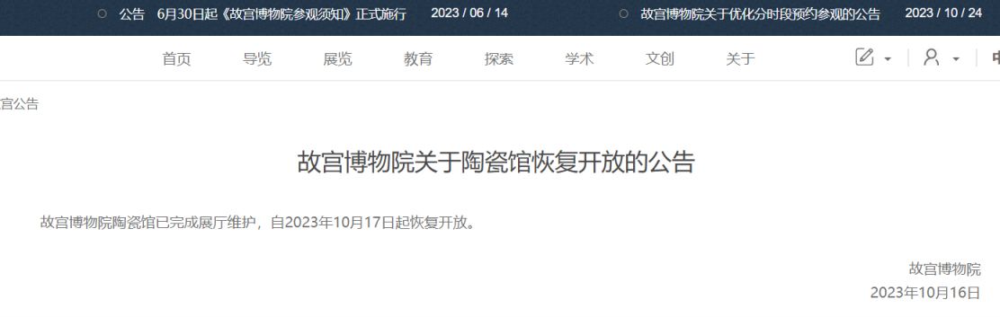 2023年10月17日起故宫博物院关于陶瓷馆恢复开放