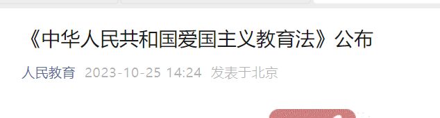 《中华人民共和国爱国主义教育法》已由中华人民共和国第十四届全国人民代表大会常务委员会第六次会议于2023年10月24日通过,现予公布,自2024年1月1日起施行。